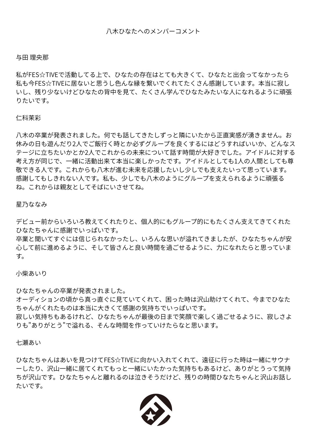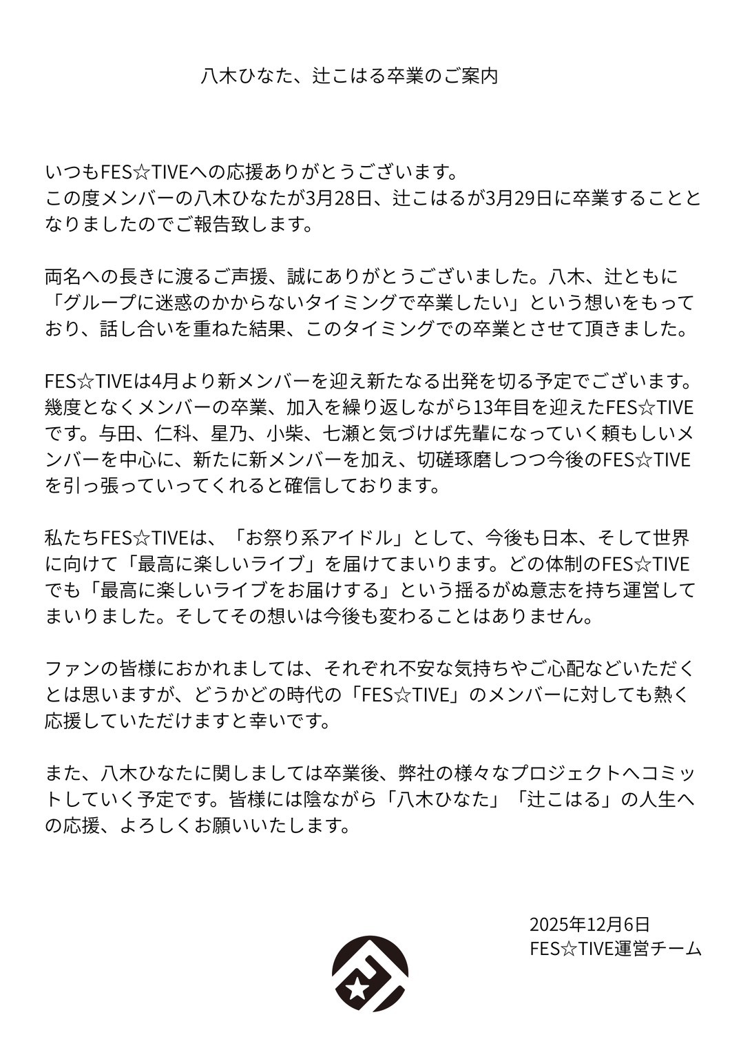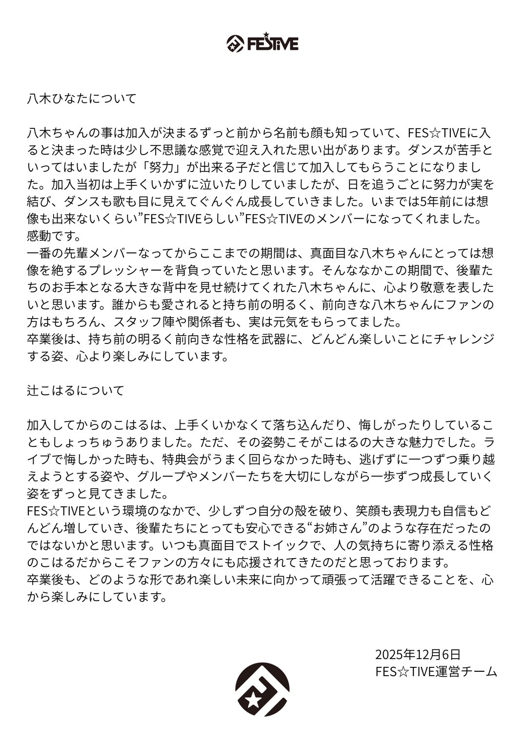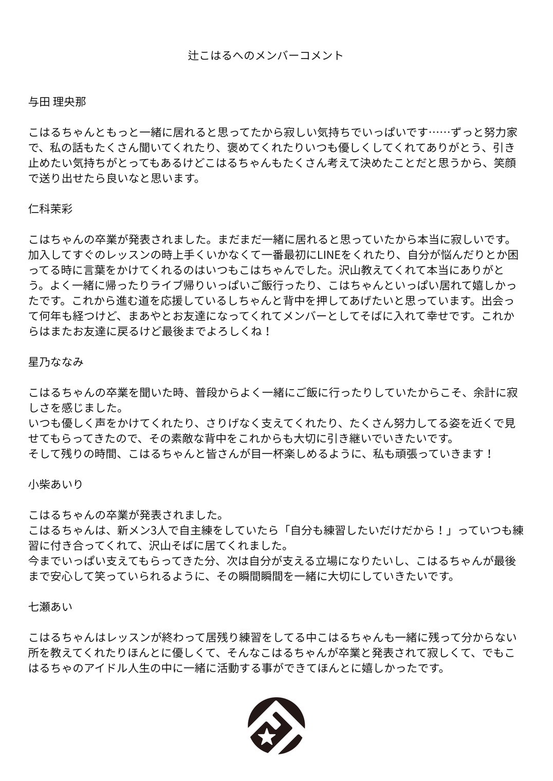 【メンバー卒業に関してのご案内及び本人、メンバーコメント】